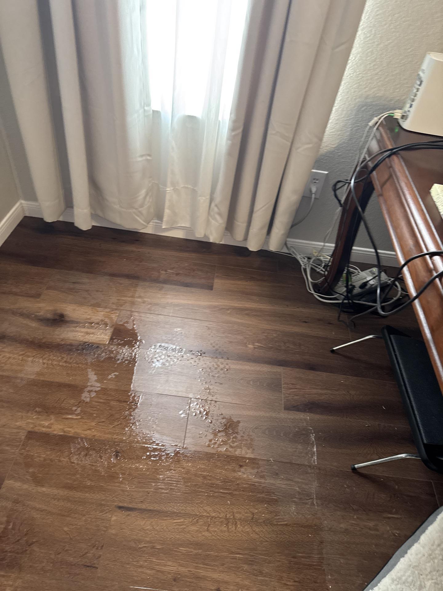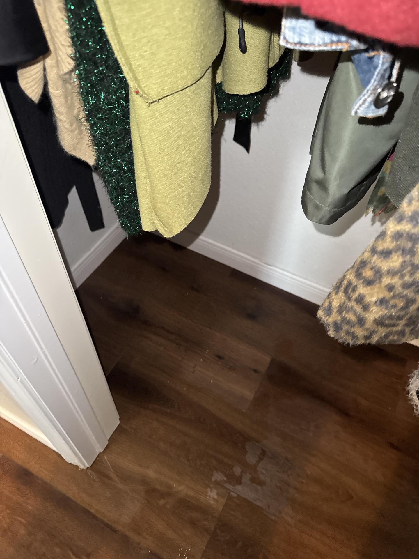 The customer experienced significant water damage affecting the laminate flooring in multiple areas of their home, including a closet and a main room, requiring professional intervention to prevent further damage and mold growth.
