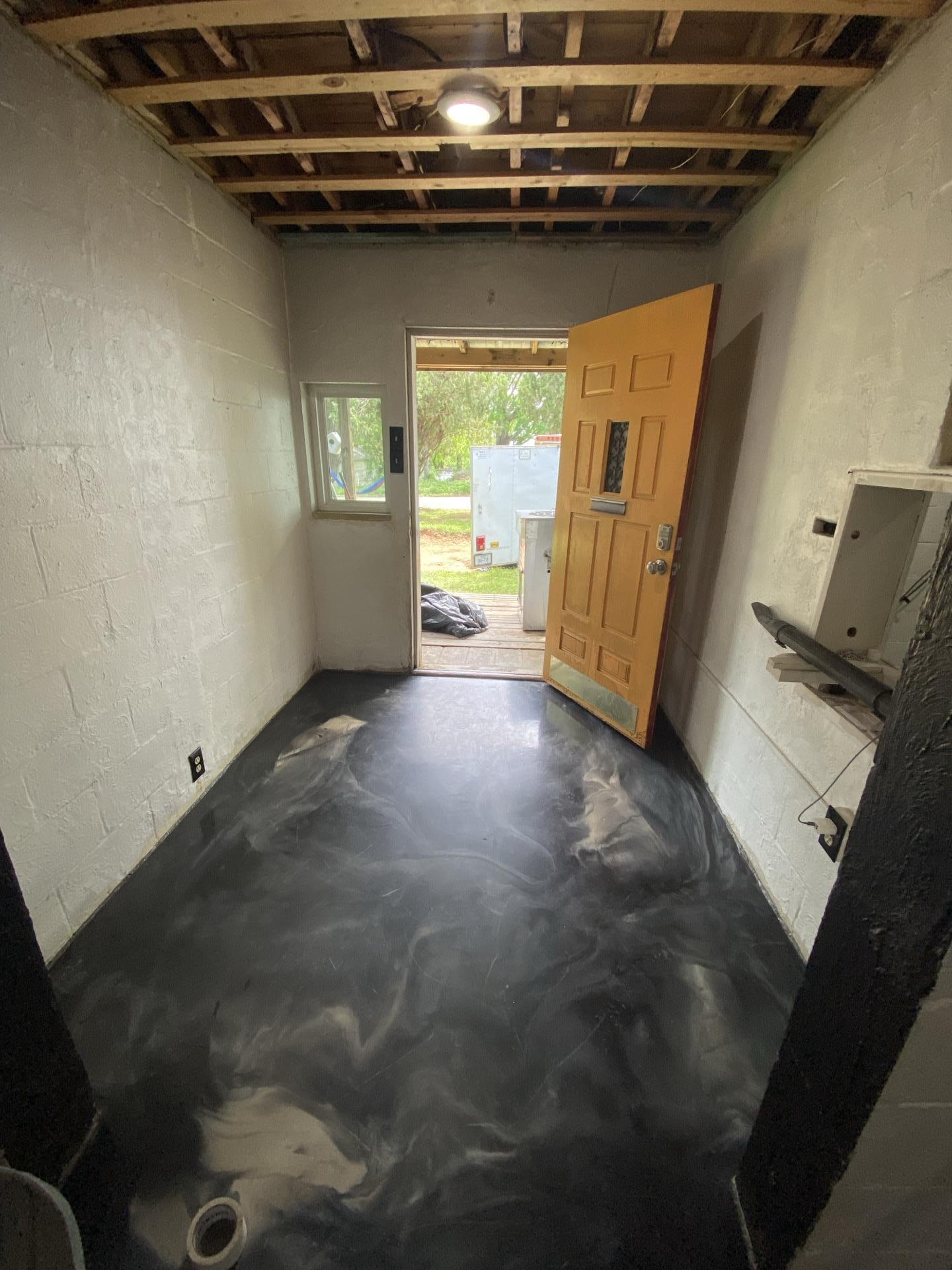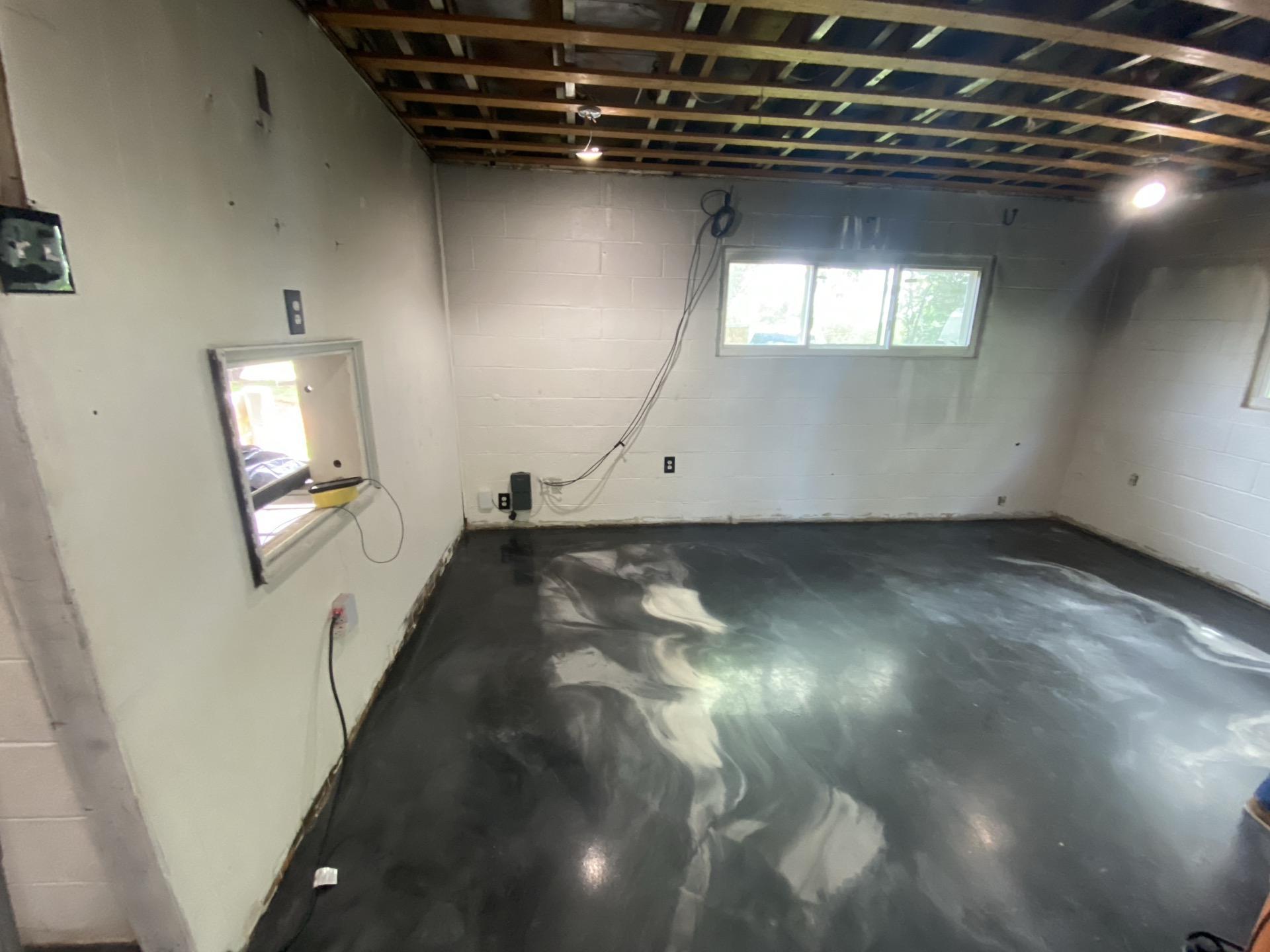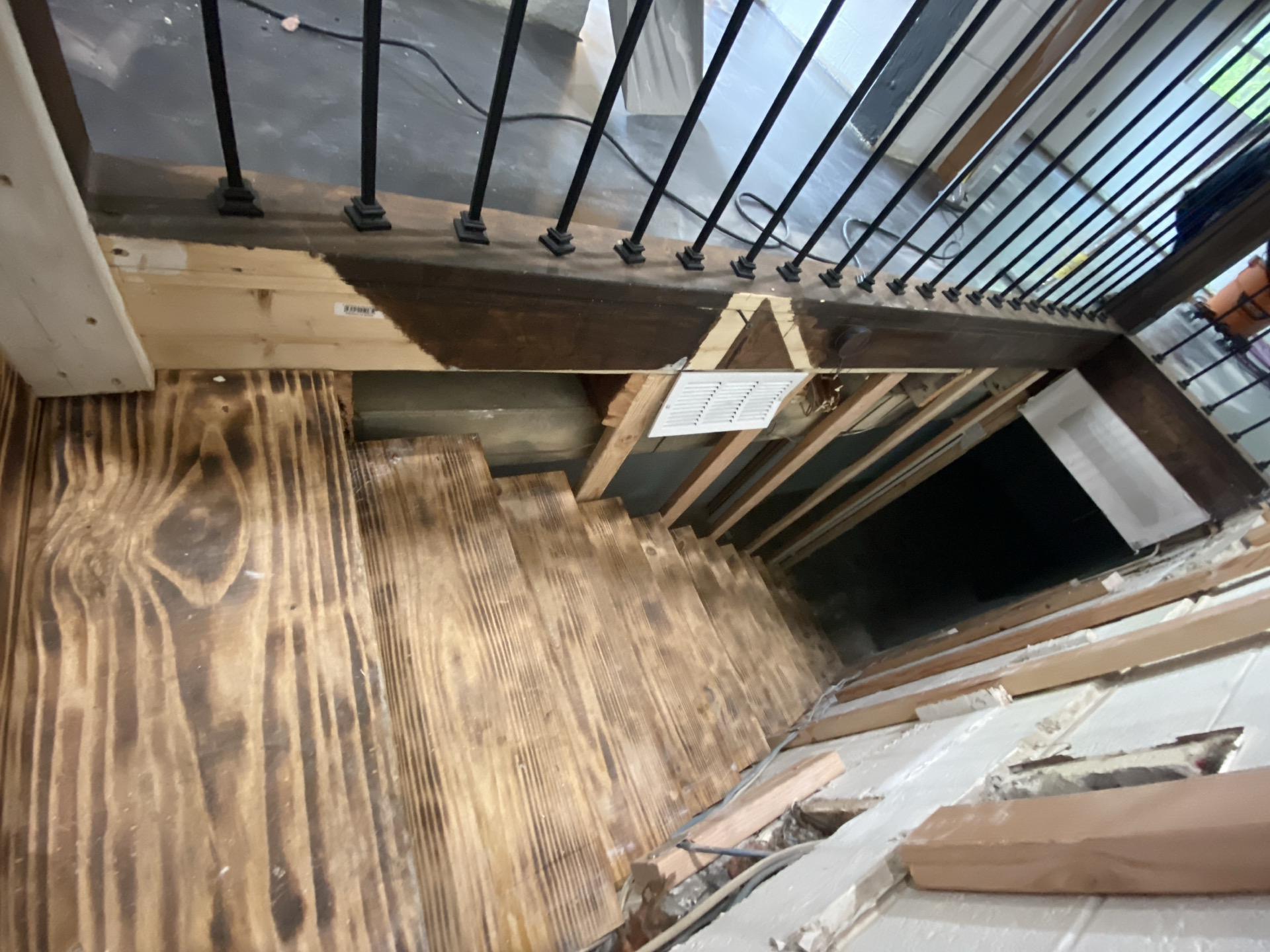 Comprehensive fire damage restoration services were provided, including initial containment and remediation of affected areas, smoke and soot removal, cleaning of concrete block walls, and installation of new metallic epoxy flooring. Structural repairs were also performed, exposing ceiling joists. The project involved restoring multiple rooms and addressing charred wooden stairs.