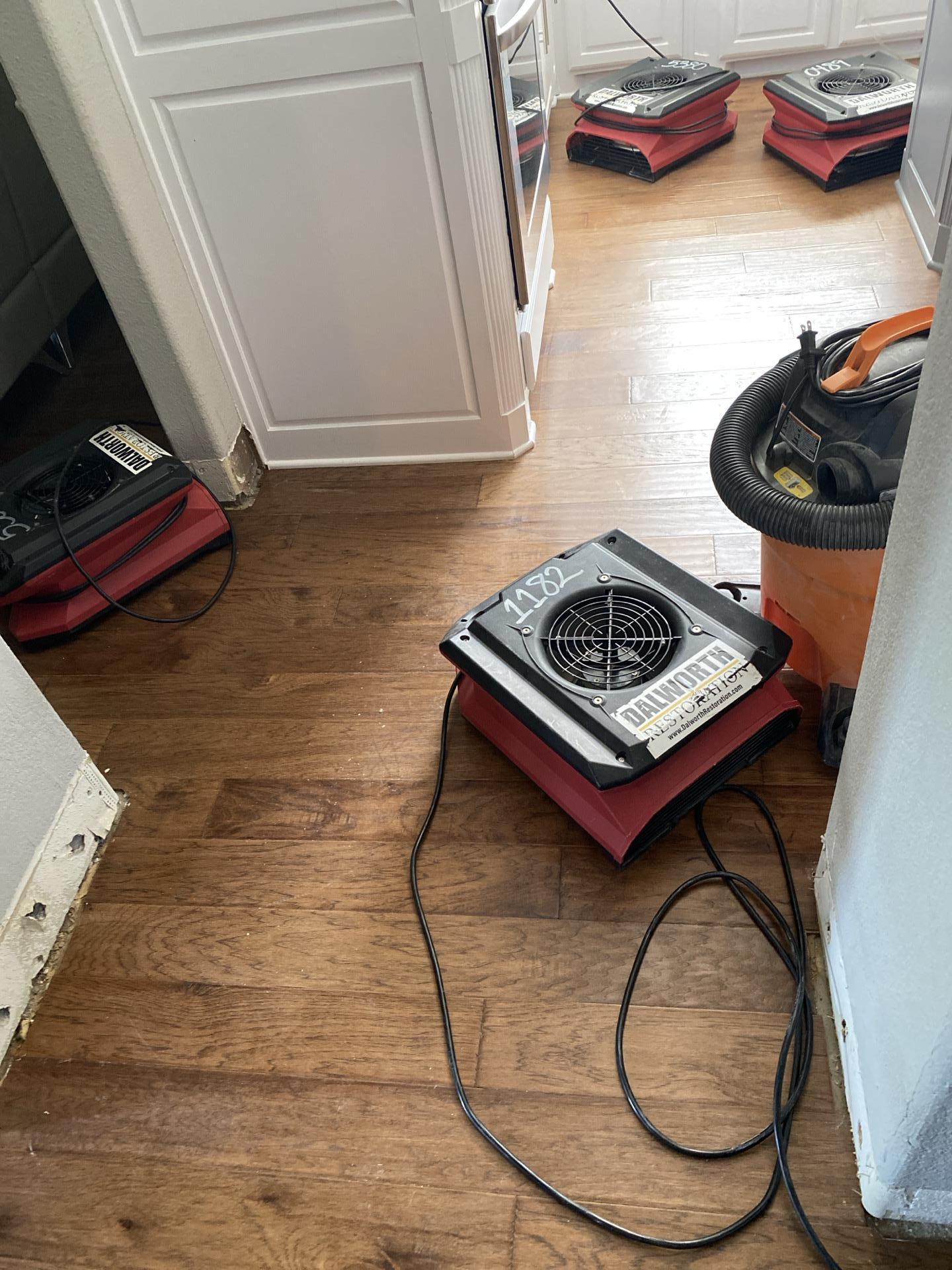 Dalworth Restoration provided comprehensive water damage restoration services, including immediate water extraction, setting up professional drying equipment like industrial air movers and dehumidifiers to thoroughly dry affected hardwood floors and structural elements in the kitchen, dining room, and laundry area, mitigating further damage and preventing mold growth.