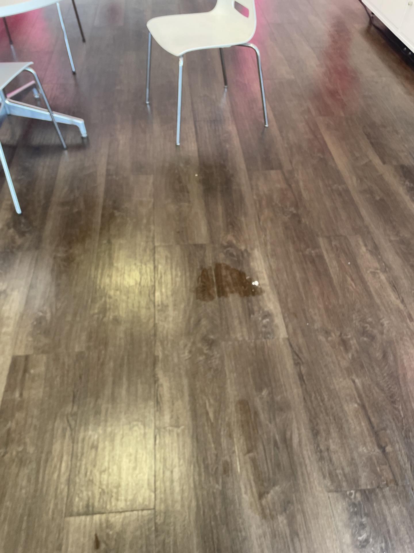 The customer reported a water damage problem in their lobby, specifically a spill or leak on the floor and potentially affecting adjacent walls.